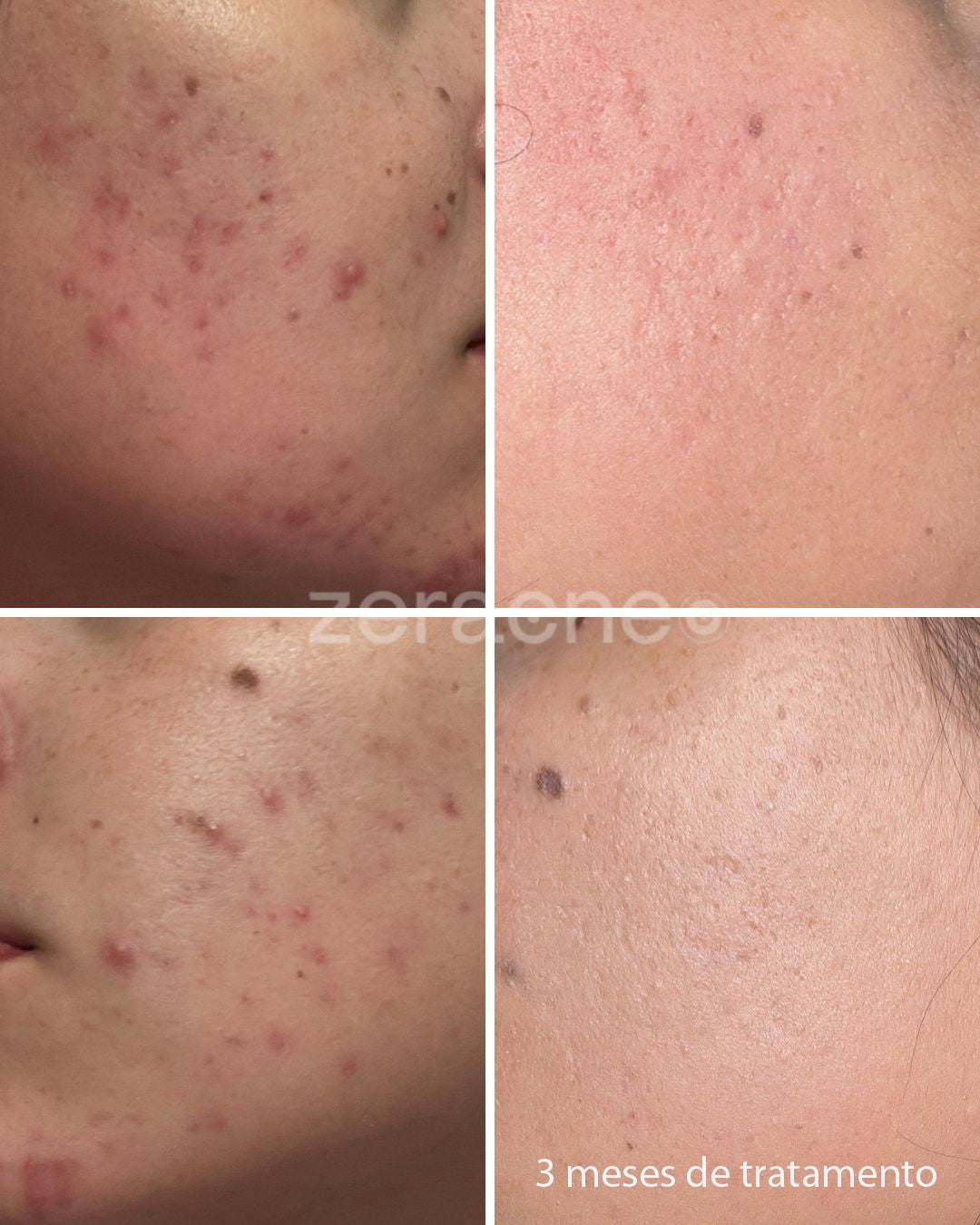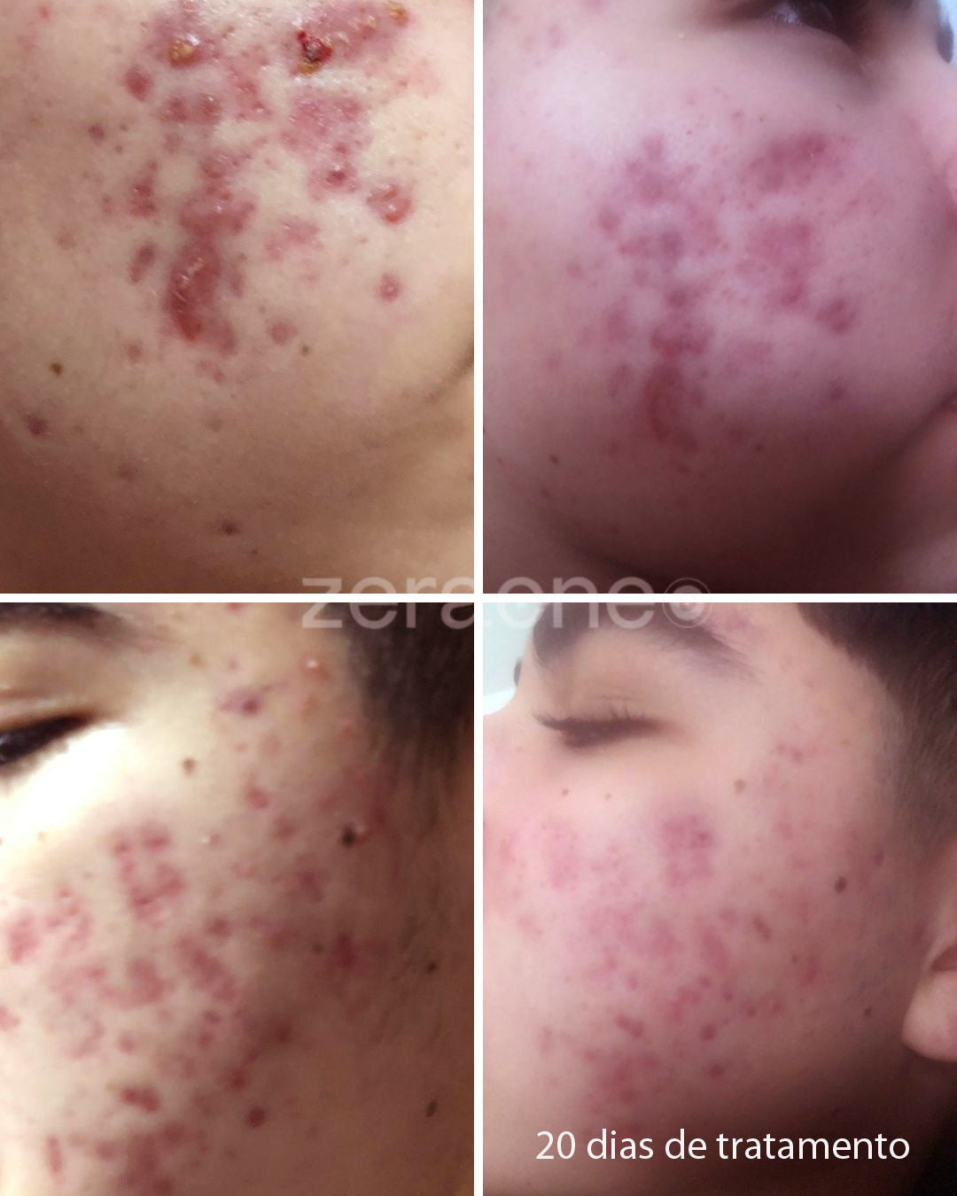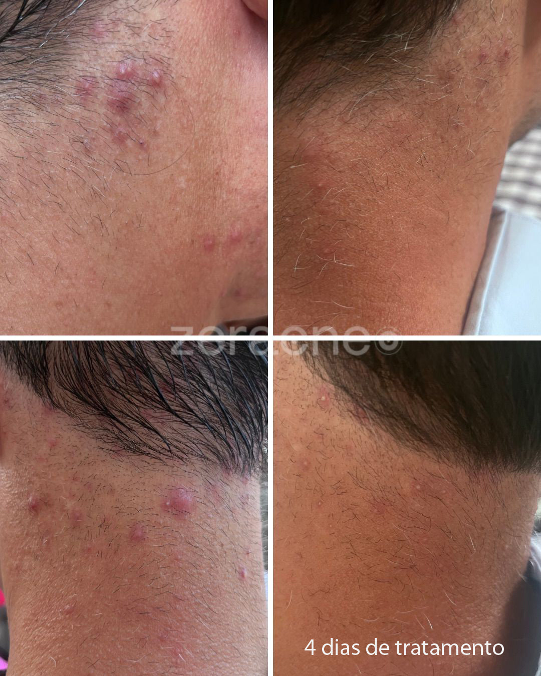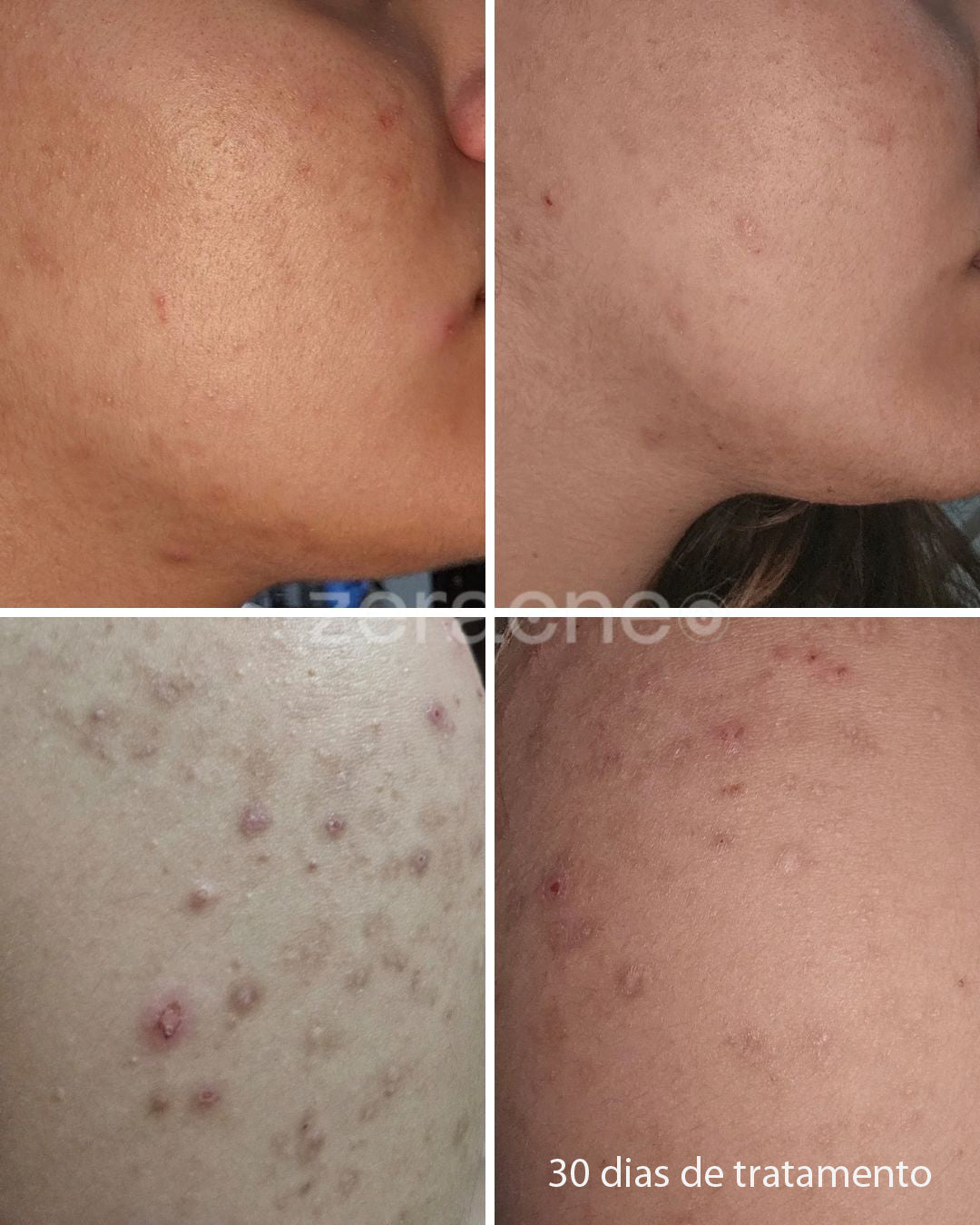 As fotos de antes e depois mostram a transformação visível da pele em poucas semanas de uso. A tecnologia ozonizada de Zeracne atua profundamente, combatendo a acne, acelerando a regeneração e promovendo uma cicatrização mais rápida e eficaz.